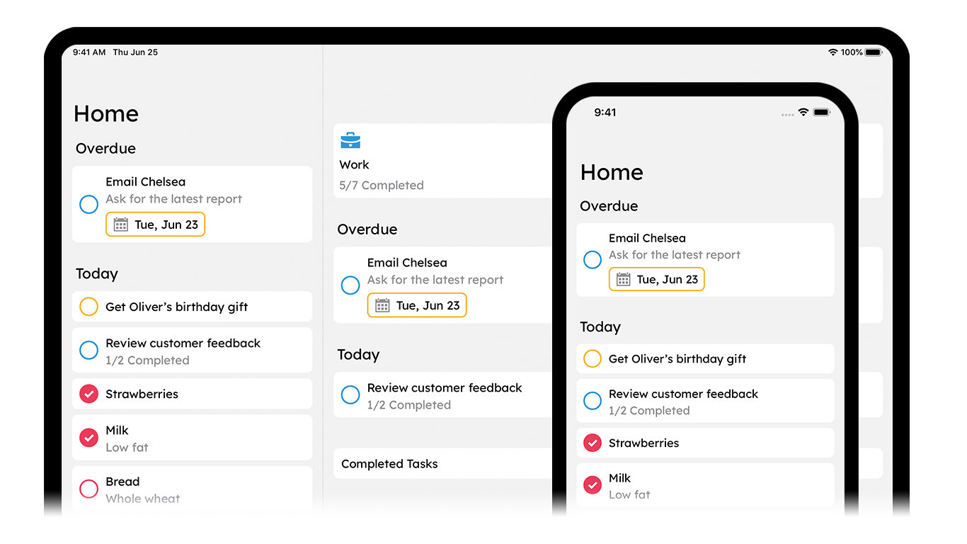 Organize your tasks into personalized lists. Data stays synchronized on your favourite devices from home, to work, to wherever. Create timed and location reminders.